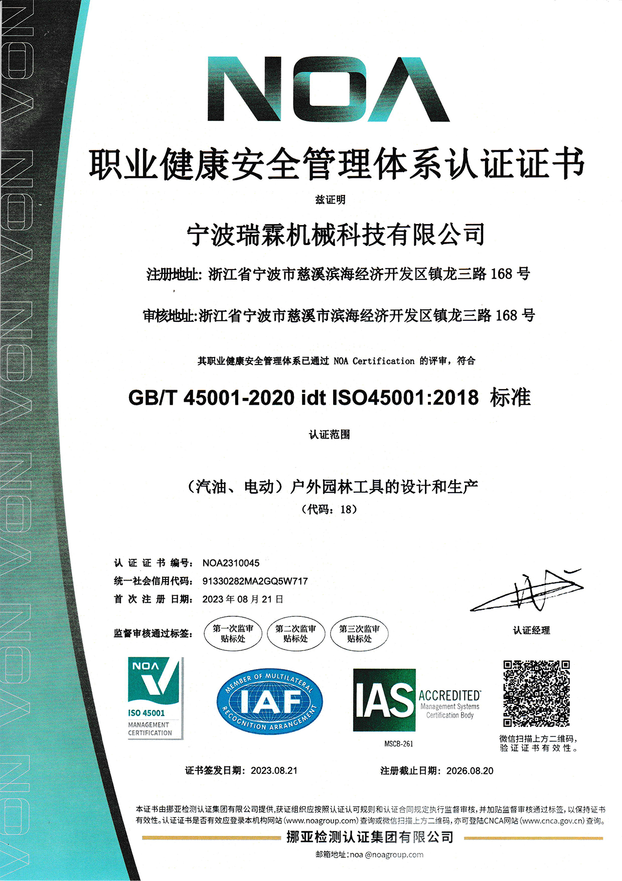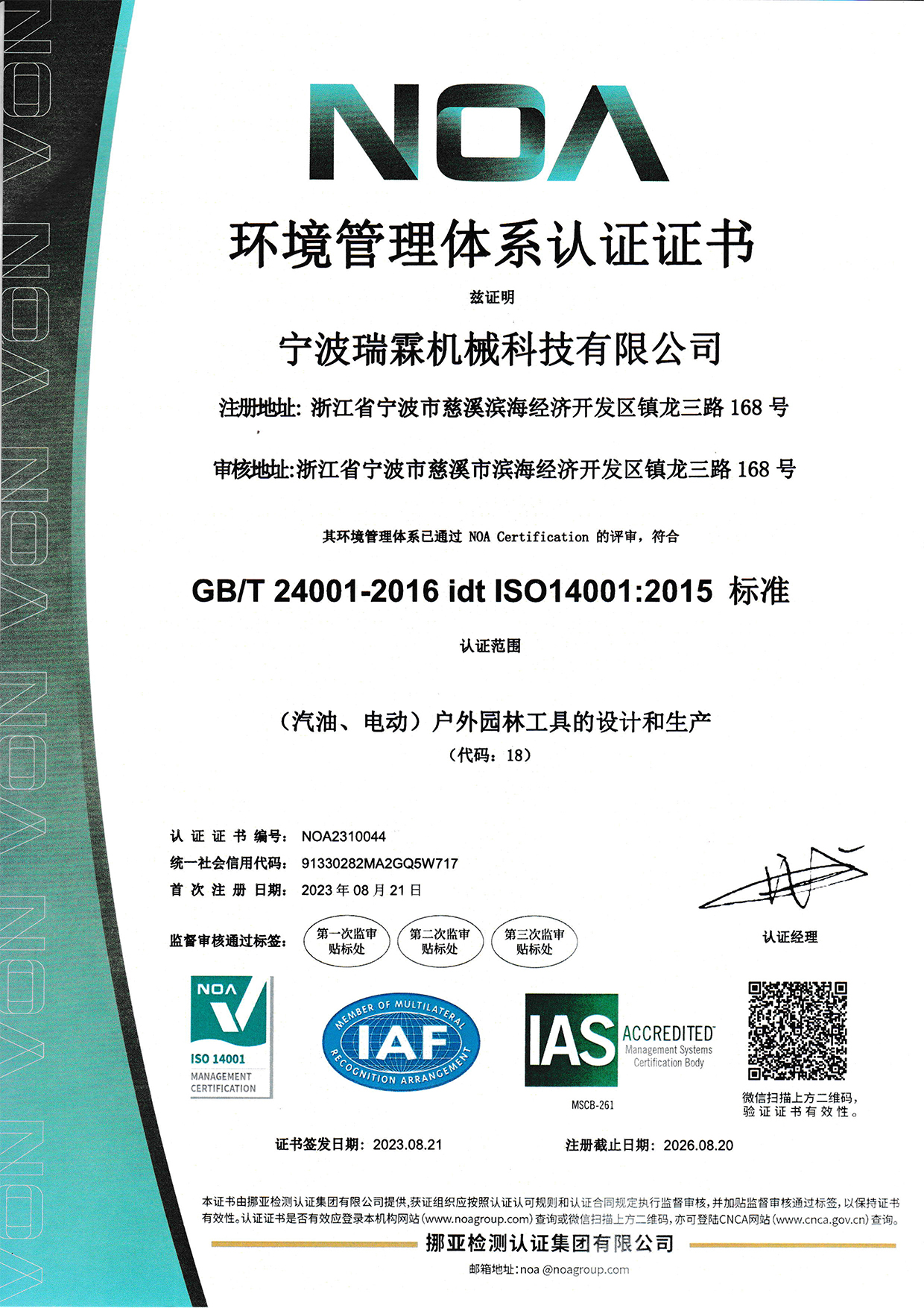 宁波瑞霖机械科技有限公司(简称NGP)是佳博平台的全资子公司,成立于2019年4月,位于浙江省慈溪滨海经济开发区镇龙三路168号,占地面积约50000平方米。公司拥有雄厚的技术力量和先进的生产设备,是行业内规模最大的企业之一。NGP集产品设计、开发、生产、销售和服务于一体,主要从事各类汽油、割草机、修枝机、打草机、链锯、吹风机等园林工具的设计研发和制造,产品远销欧洲、美洲、大洋洲等多个国家和地区,同时内销全国各地。作为国家知识产权优势企业,公司注重产品设计,并在此基础上采用先进的精益生产方式,以7S活动规范现场管理,以量身打造的ERP系统整合及有效利用企业资源,以ISO 9001:2015等标准来完善公司质量管理体系,并通过“GS”、“EMC”、“CE”、“UL”等认证来确保产品的安全性和可靠性,已取得各地区出口许可证和自营进出口权。